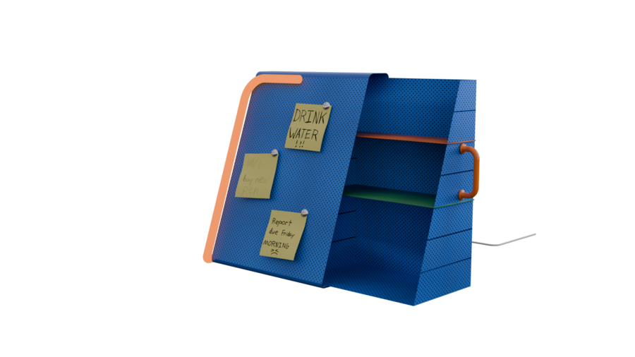 — упорядочивание предметов: съёмные полки позволяют свободно заполнять и освобождать необходимое пространство; — работа с заметками: с внешней стороны к доске крепятся магнитные гайки для фиксации стикеров; — подсветка: LED-провод дополнительно освещает рабочее пространство стола.