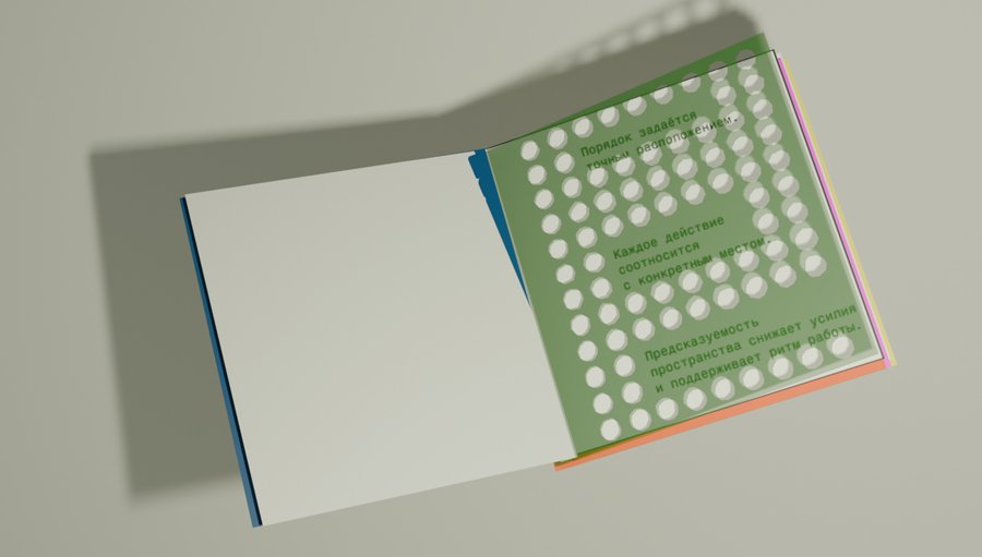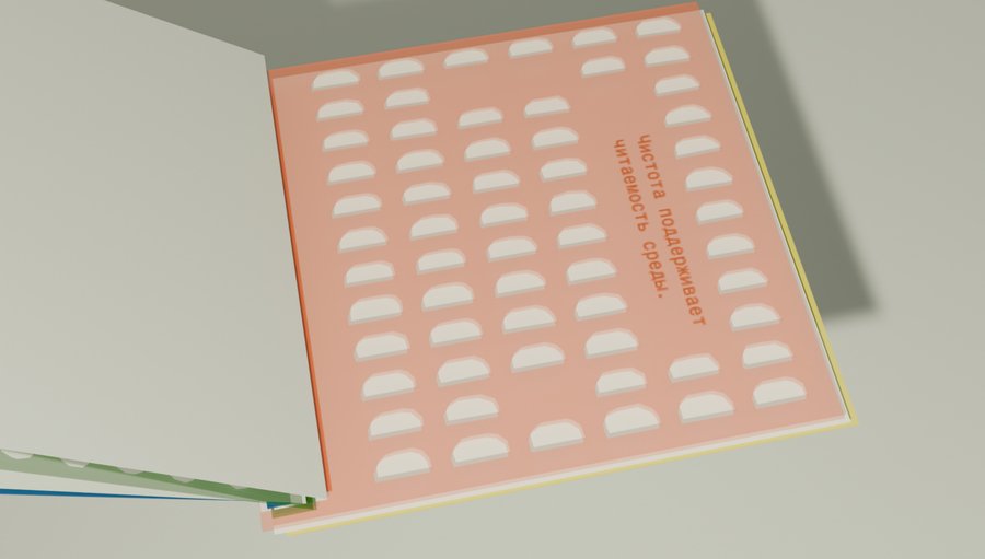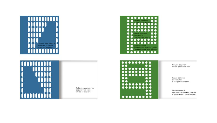 Чтобы отразить важность пустого пространства я использовала маленькие тексты, которые разделялись полпрозрачными перфорированными листами бумаги.