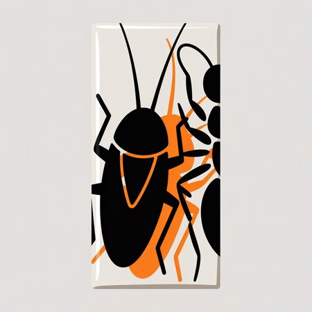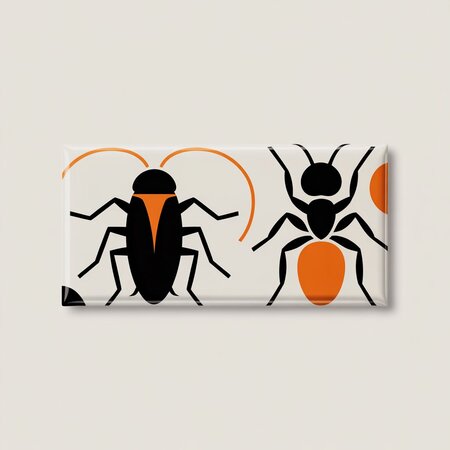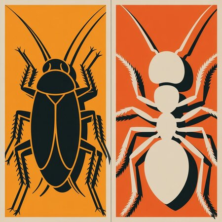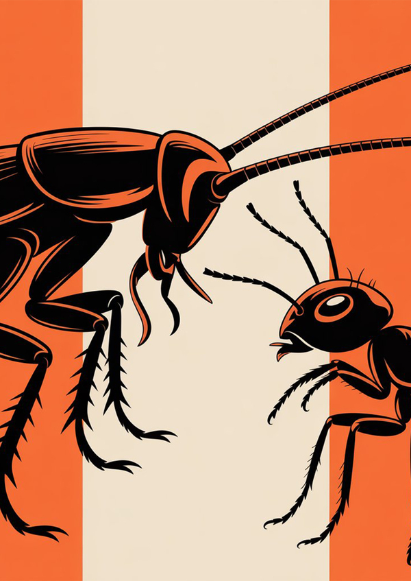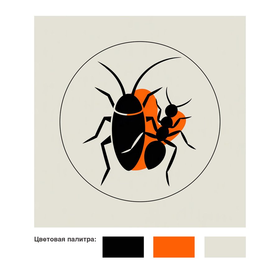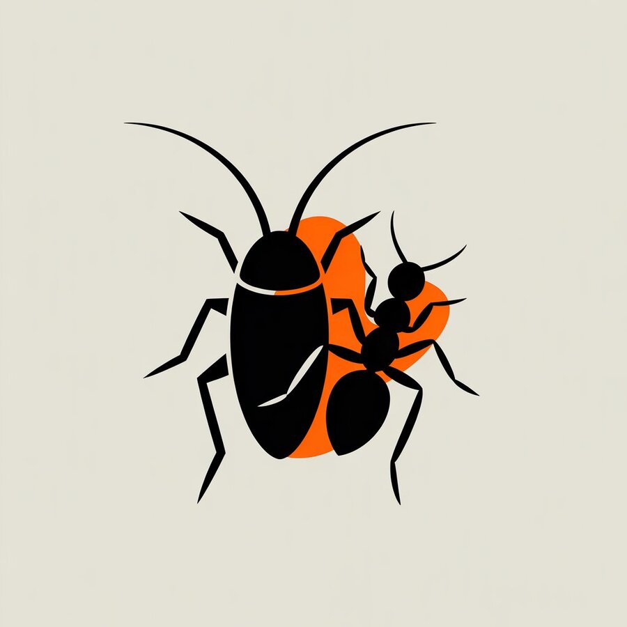 Generate a logo. In its design, use the images of a cockroach and an ant, use black, orange and white colors. It should be simple and graphic, without text.