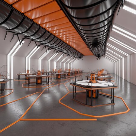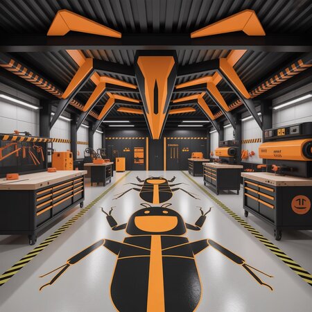 Generate a three-story building. In its design, use the images of a cockroach and an ant, use black, orange and white colors.