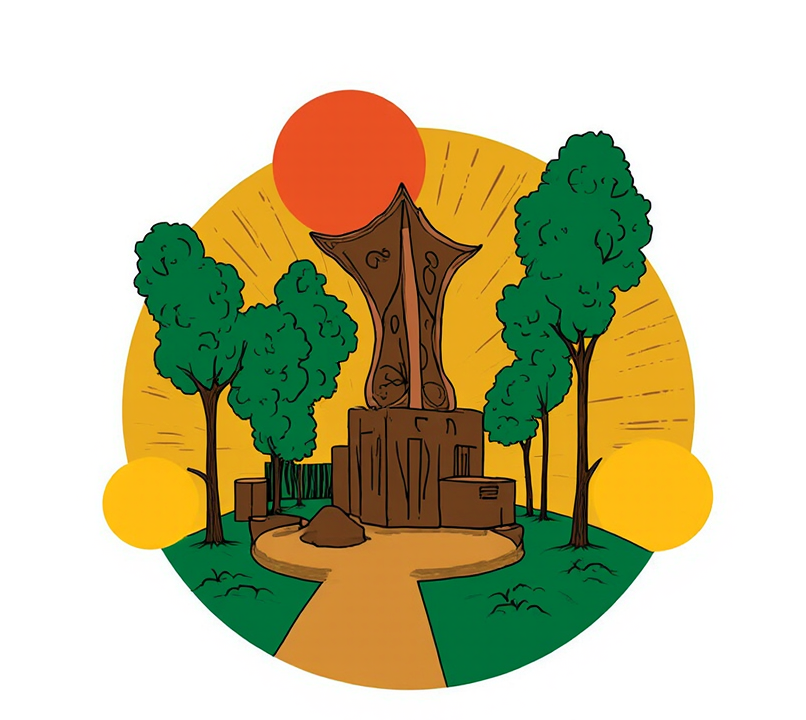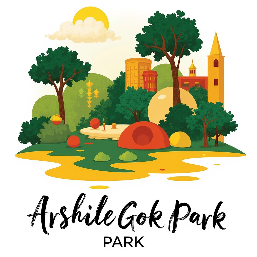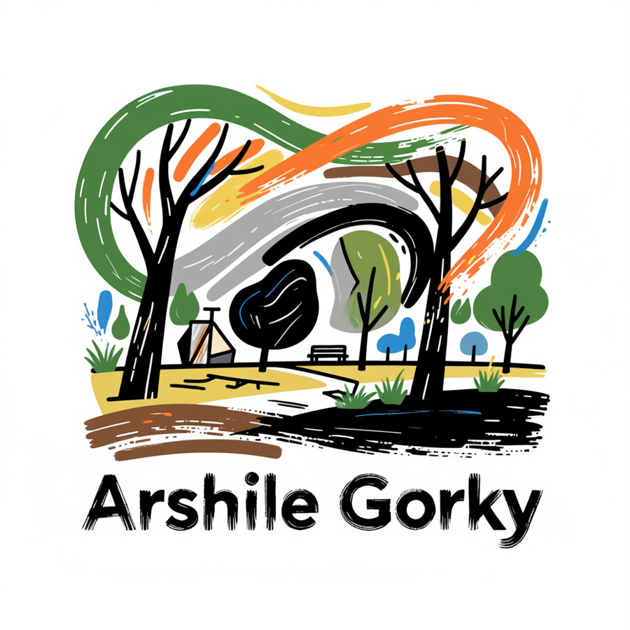 logo promt: create a logo design with a picture for the park of the artist Arshile Gorky. The image repeats the style of Arshile Gorky. Abstract expressionism. Greenery, park, trees and the art object in the middle. Geometrical forms. At the bottom of the name of the park. Unusual font. The text «Arshile Gorky» is integrated at the bottom in bold, a part of the composition. Background: pure white. Style: graphic, illustrative. Green, orange, yellow, red, brown colors.