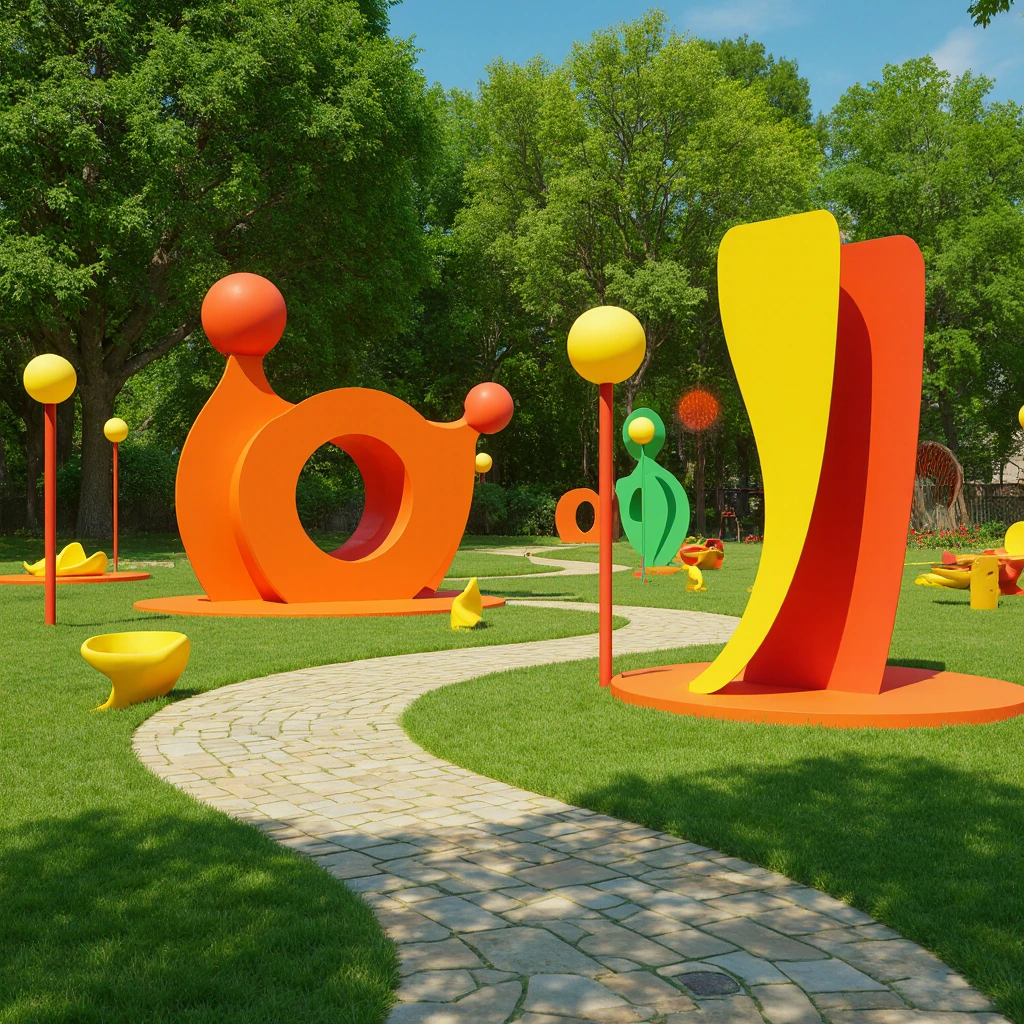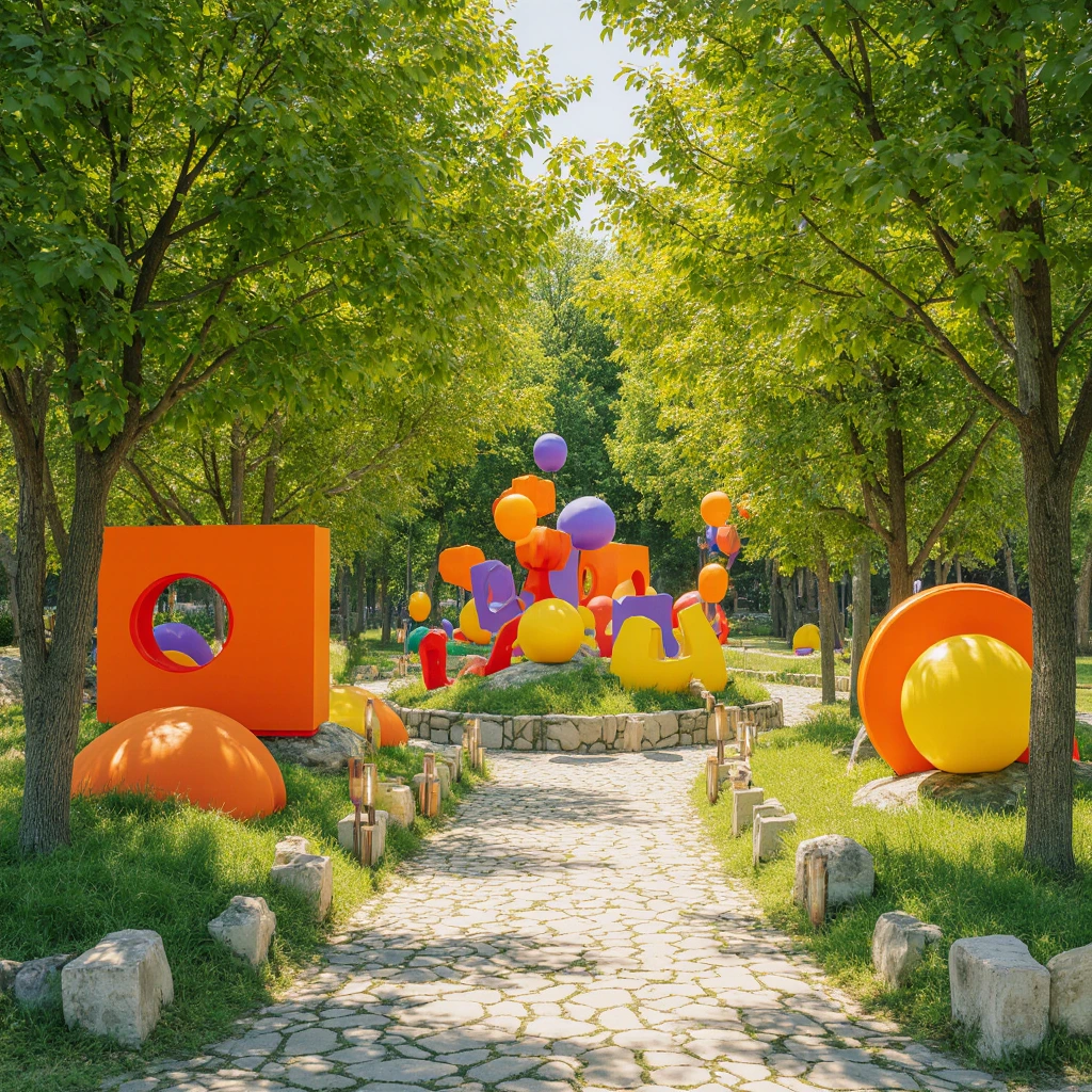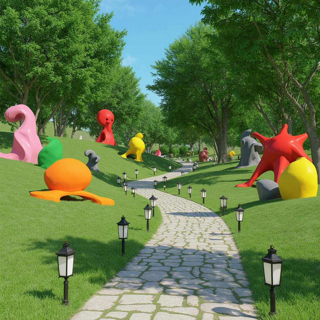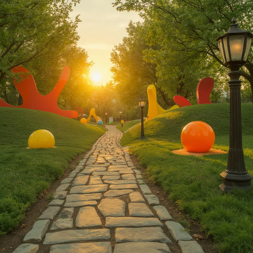 park promt: Create the park of the artist Arshile Gorky. Realistic image. Sunny park. Lots of greenery and trees. Unusual art objects in the style of Archil Gorky stand along the stone paths and on the hilly hills. Park elements and art objects in the style of abstract expressionism. Green, orange, yellow, red, pink, gray and green colors. Narrow black lines. Stone paths. Lanterns. Bright playground.