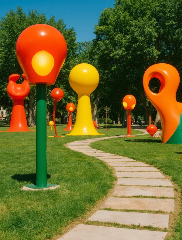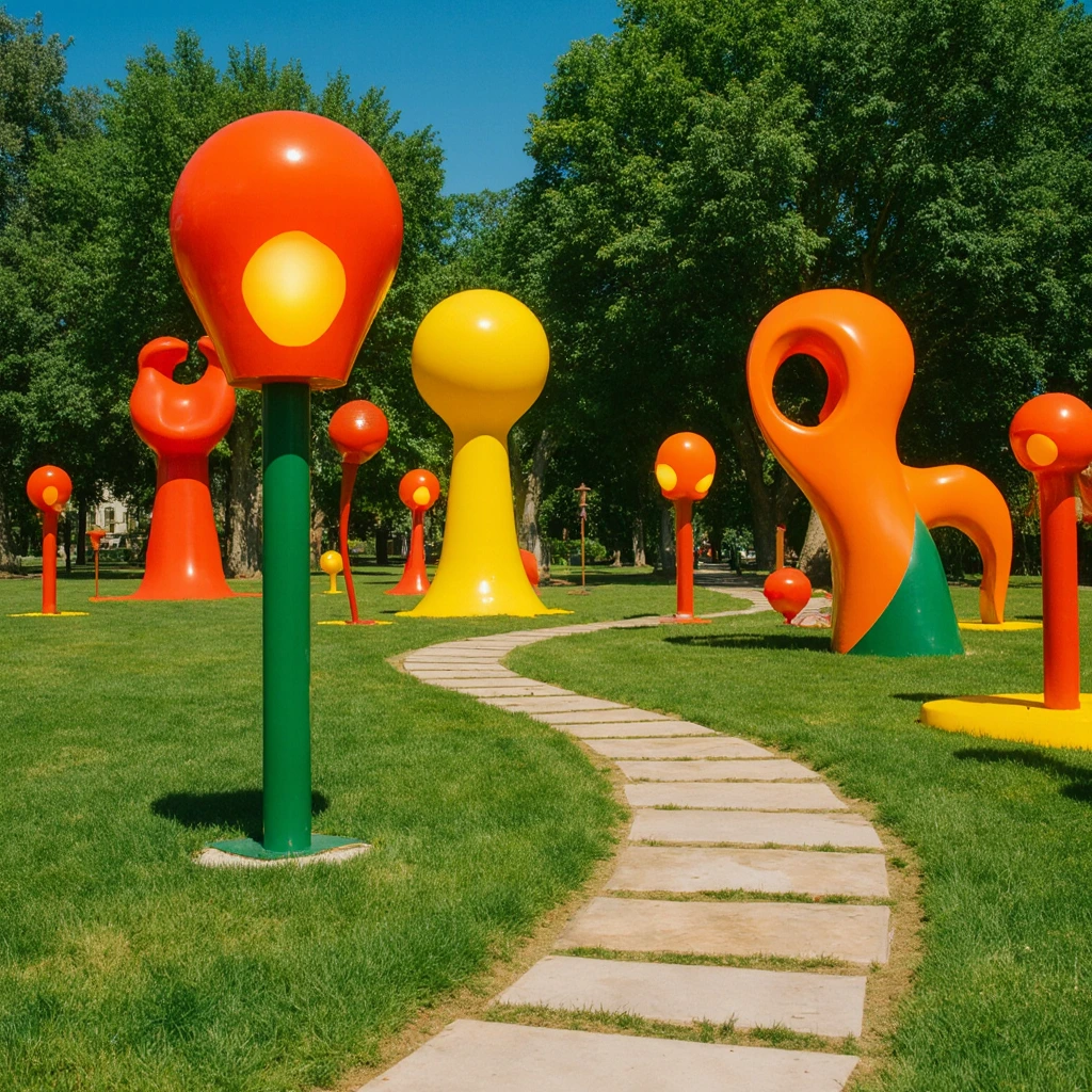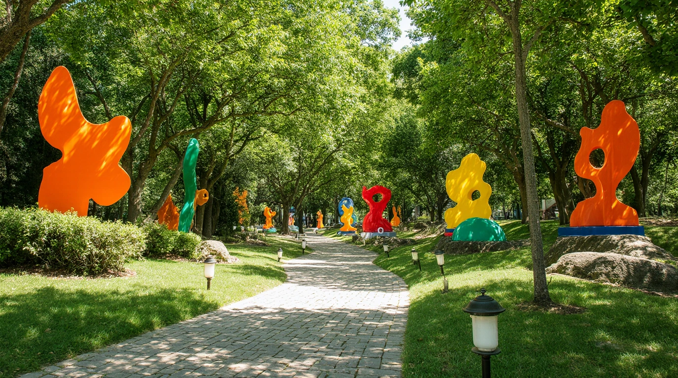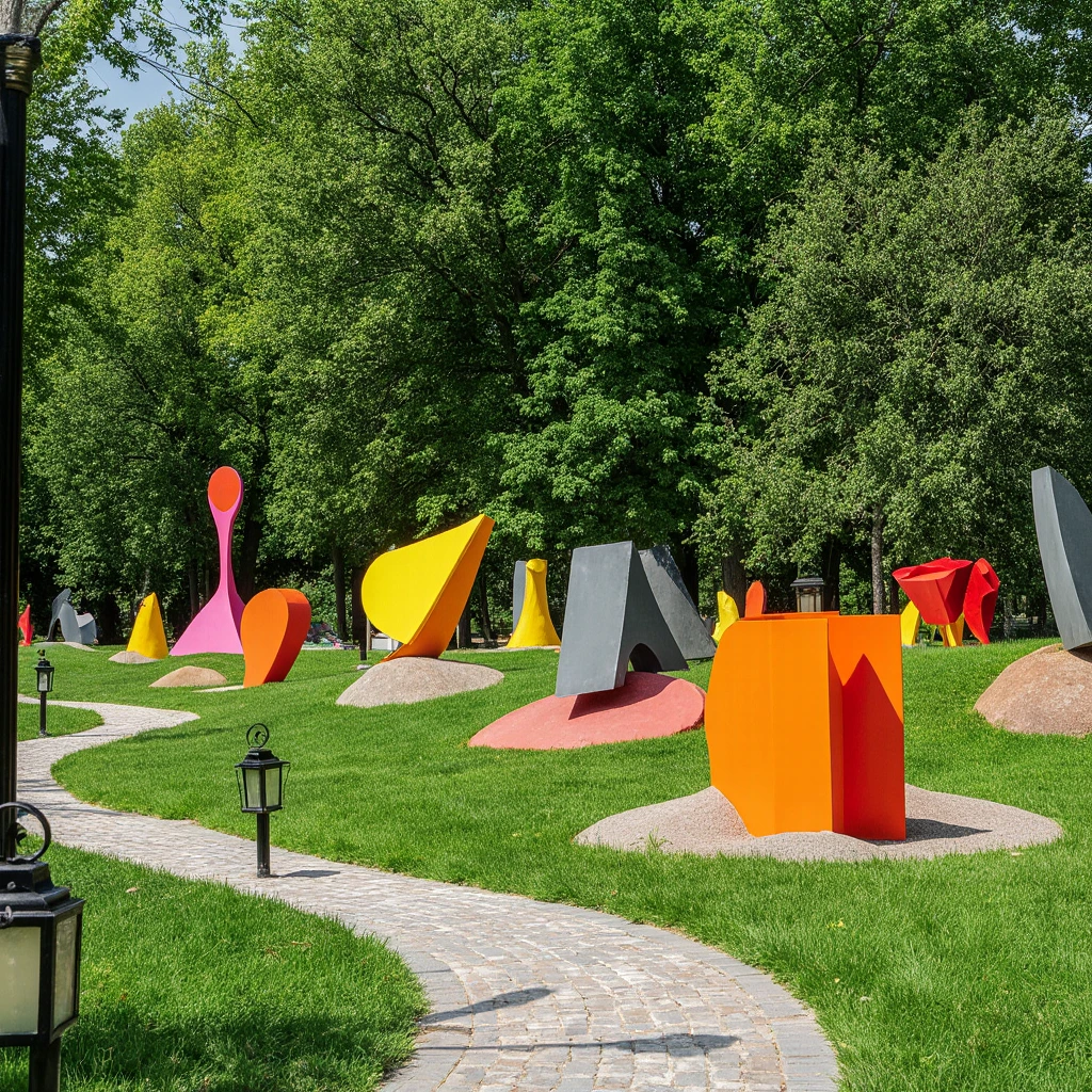 park promt: Create the park of the artist Arshile Gorky. Realistic image. Sunny park. Lots of greenery and trees. Unusual art objects in the style of Archil Gorky stand along the stone paths and on the hilly hills. Park elements and art objects in the style of abstract expressionism. Green, orange, yellow, red, pink, gray and green colors. Narrow black lines. Stone paths. Lanterns. Bright playground.