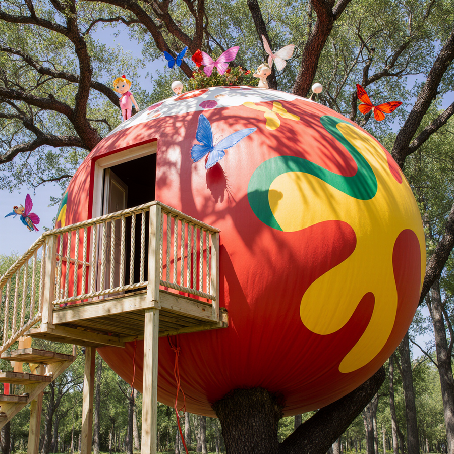 treehouse promt: Create a bright tree house for children in Arshile Gorky’s park. A house in his style. Bright and colorful. Abstract expressionism. The colors are red, green, and yellow. The weather is sunny.