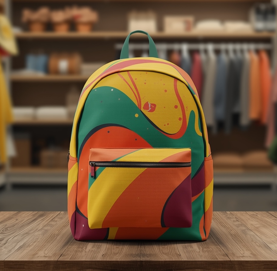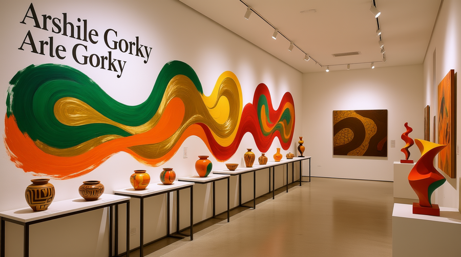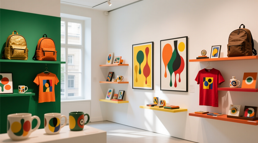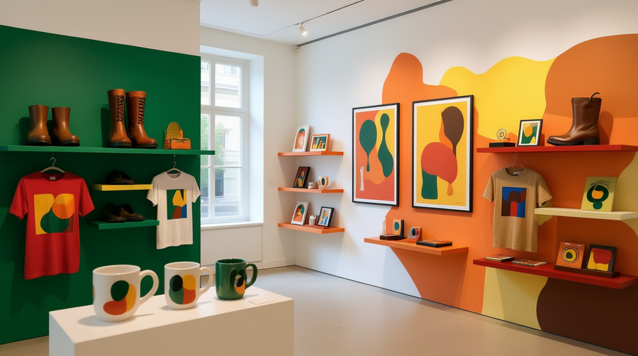 Promt: Showroom for artist Arshile Gorky. In green, orange, yellow, red, brown tones. Bright warm accents on a white background. The walls are white. Realistic image. There are goods on the shelves: backpacks, T-shirts, mugs, posters, souvenirs. Bright products. Abstract style. Souvenir shop