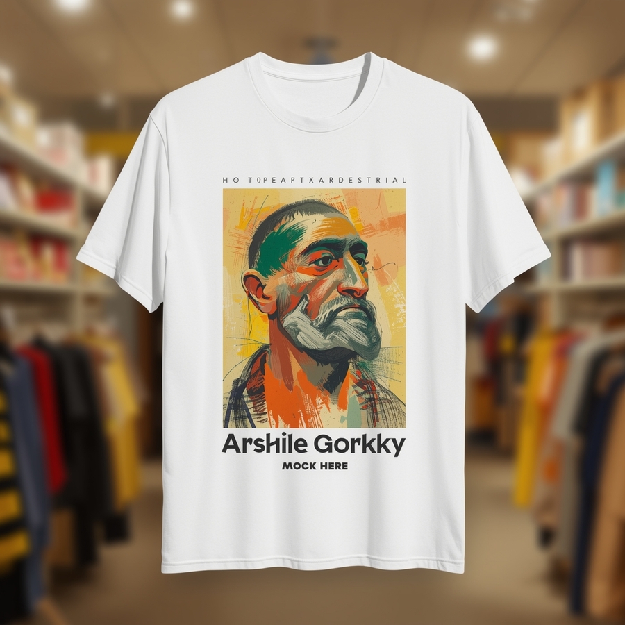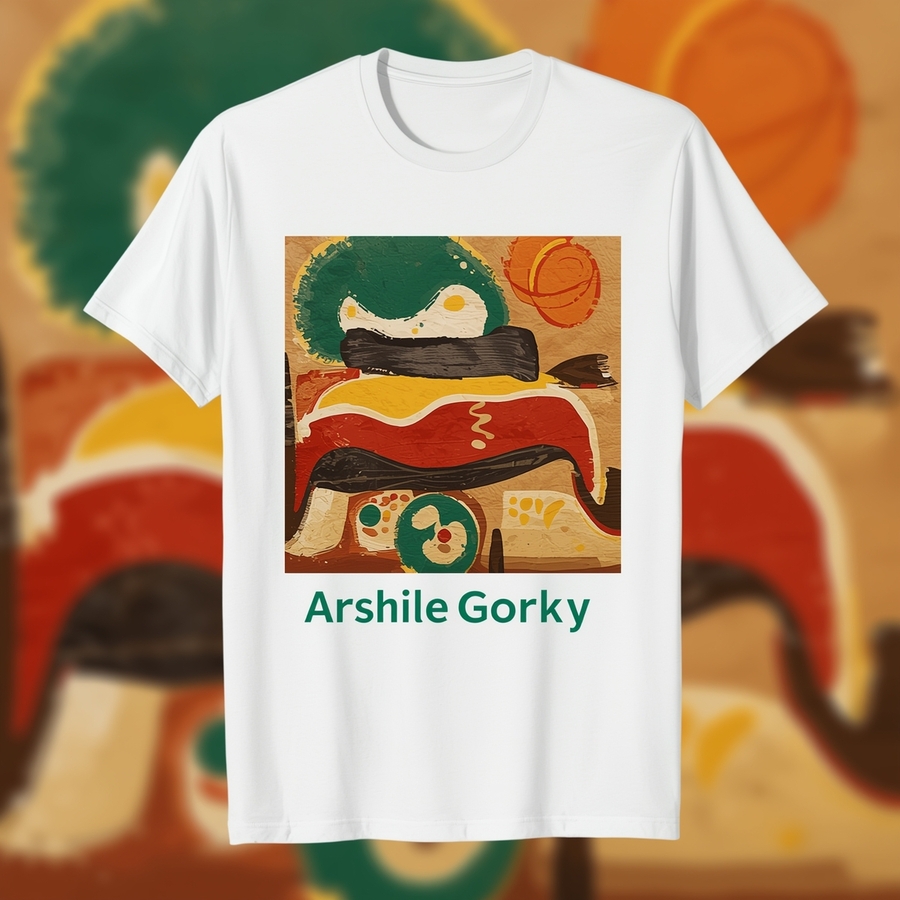 Promt: Generate photorealistic product mockups in the abstract expressionist style of Arshile Gorky, featuring: - a white t-shirt Realistic image style. Abstract expressionism. Bright warm accents on a shop background. Use the context. Bright color green, orange, yellow, red, brown tones. The text «Arshile Gorky» soft wavy line.
