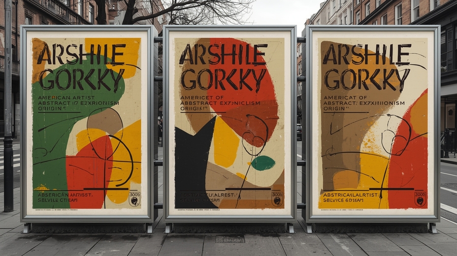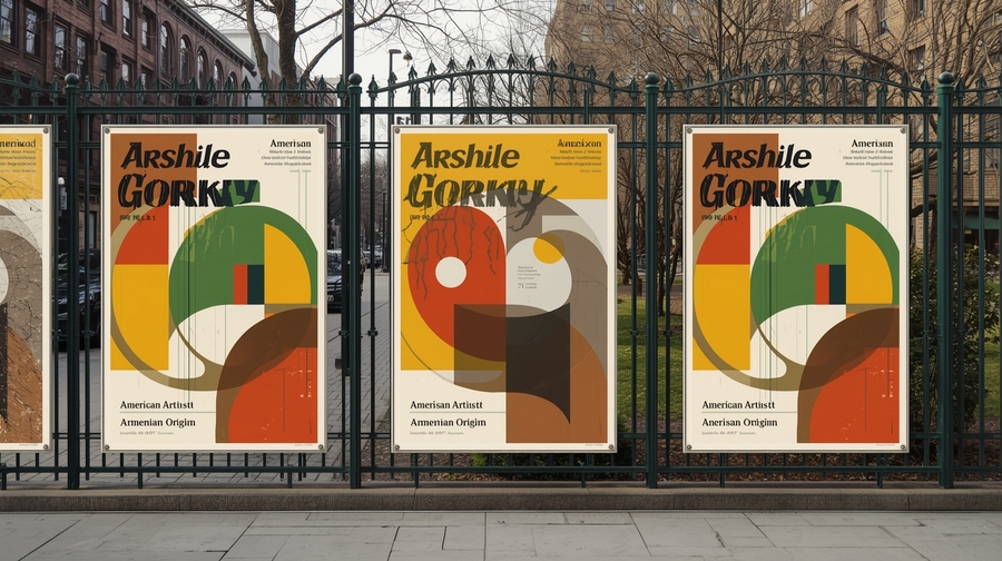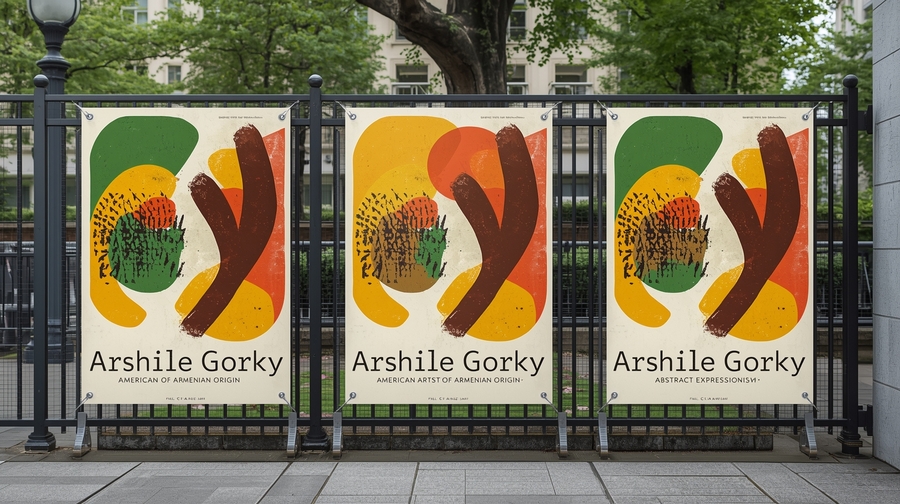 Promt: A photorealistic layout of street posters and banners in the style of abstract expressionism by Arshile Gorky, placed on city walls, park fences, and lampposts. The design features abstract curved and simple geometric shapes. The color palette is brightly colored with muted elements, including green, red, brown, and a predominance of yellow, with a touch of black thin lines. Each banner features the text «Arshile Gorky» in a distorted handwritten lowercase font. Additional typographic elements create a minimal biographical context, such as «American Artist of Armenian Origin, Abstract Expressionism,» which is set in a clean, thin font.