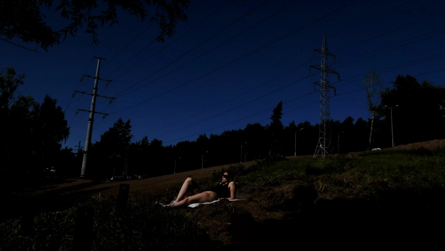 В перформансе «Блэкаут» Александра Тен помещает себя в состояние пассивного, но преднамеренного наблюдения. Художница неподвижно лежит на травянистом склоне в чёрных очках, фокусируя всё своё внимание на созерцании солнечной вспышки до её полного исчезновения.