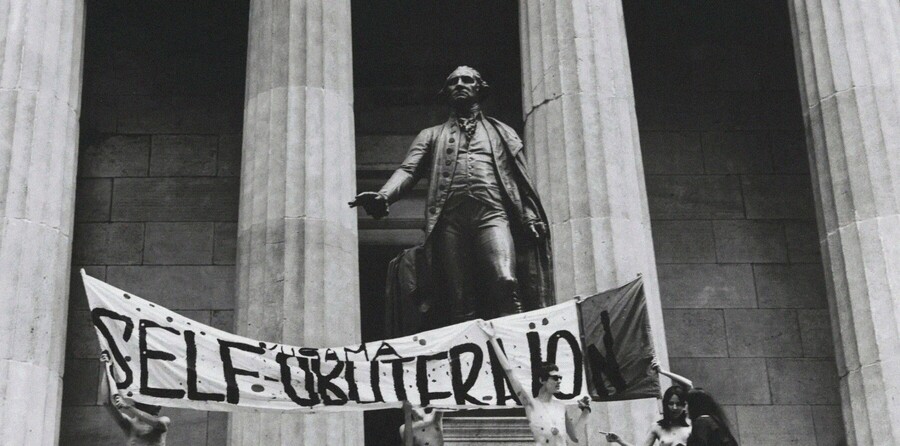 В «Анатомический взрыв» Яеи Кусама покрывает обнаженные тела горошком на улицах Нью-Йорка. Это одновременно антивоенная акция и телесный протест против милитаризма и капиталистических структур. Тело здесь политический инструмент. Оно становится живым лозунгом, проявлением мира и уязвимости.