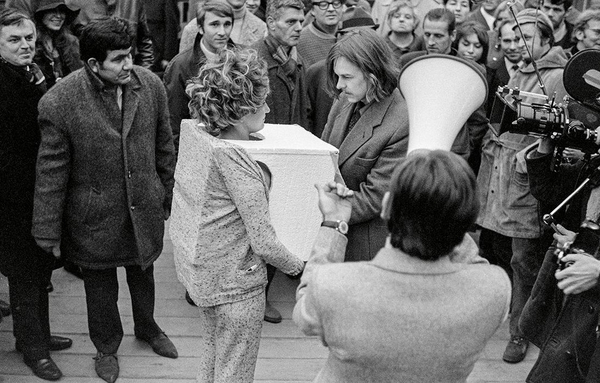 «Кино прикосновений» Валие Экспорт — радикальный ответ на мужской взгляд в культуре и медиа. Художница надевает коробку-кинотеатр на грудь, предлагая зрителям «смотреть фильм» руками. В этом парадоксе — отказ от роли объекта: Экспорт возвращает контроль над телом себе, превращая прикосновение в акт осознанного выбора.