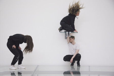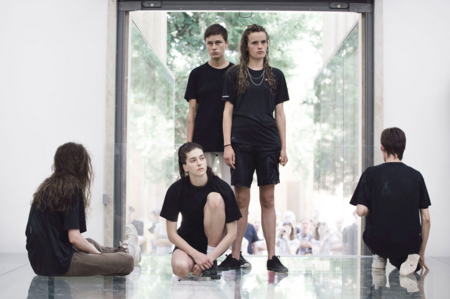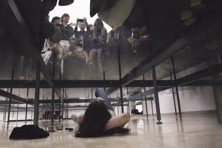 В «Фауст» Энн Имхоф создает многоуровневое пространство из стекла и отражений, где перформеры движутся среди зрителей над и под ними. Контакт здесь дистанцированный, происходящий через взгляд и через разделенное пространство. Зритель оказывается внутри перформанса, но без возможности прямого взаимодействия: он наблюдает, записывает, перемещается, становясь частью общей хореографии.