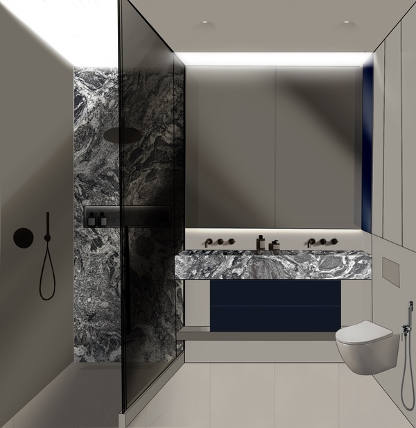 Следующий этап — планировочное решение. На основе брифа, заполненного заказчиком, я зонировала помещение для всех членов семьи, выделила место для просторной гардеробной, постирочного блока и гостевого санузла.