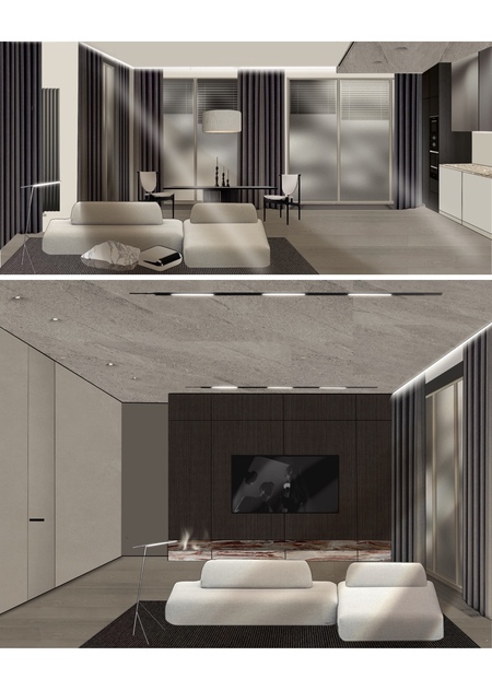 После согласования планировочного решения и мудборда, я приступила к созданию 3D коллажей в программах Sketch Up и Procreate. Коллажи как инструмент сочетают в себе наглядность объёмной визуализации и гибкость правок. Они помогают быстро оценить композицию, цвет и атмосферу проекта, экономя время на рендеринг и доработки. Благодаря им можно на раннем этапе согласовать концепцию с заказчиком, избежав сложных переделок в будущем.