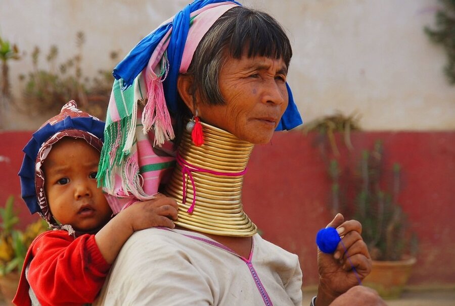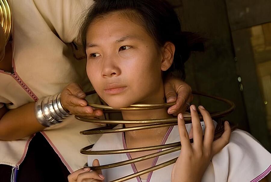 В племени падаунг существует традиция ношения многочисленных медных спиралей на шее, создающих впечатление её значительного удлинения. Девушкам начинают надевать первые кольца с раннего возраста, около пяти лет, постепенно добавляя их с течением времени. На самом деле, сама шея почти не вытягивается — давление колец приводит к деформации верхней части грудной клетки и плеч.