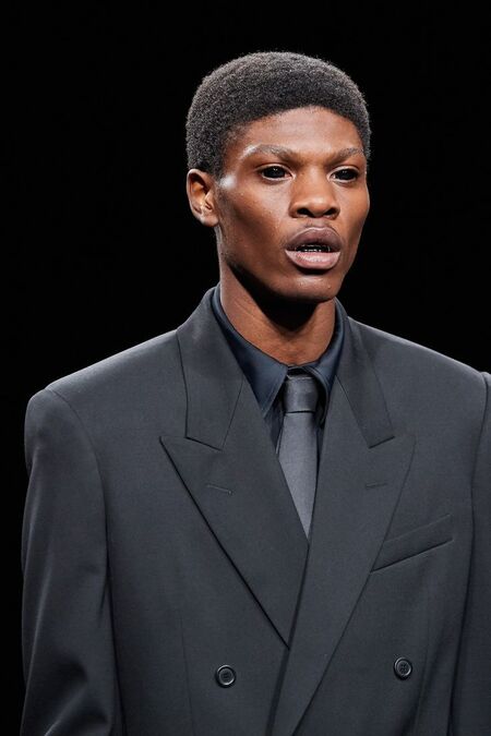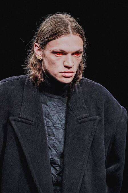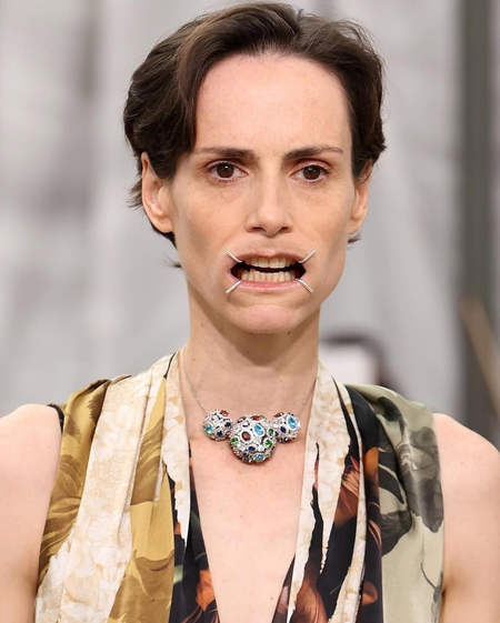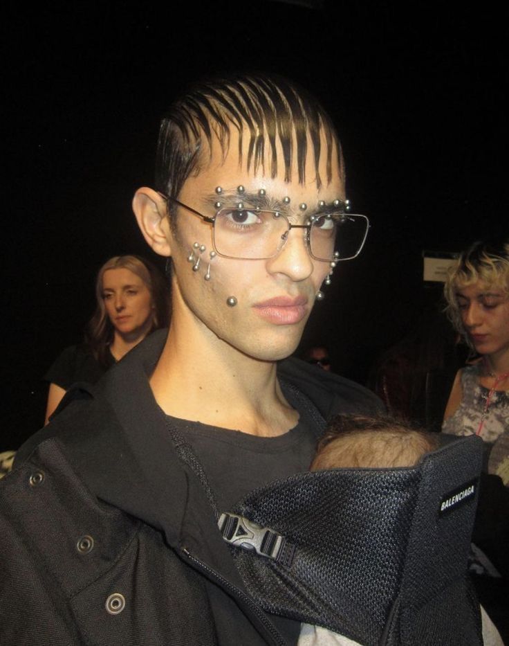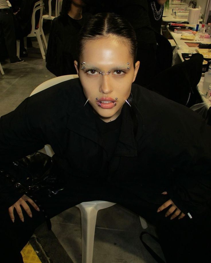 Модель Амелия Грей Хэмлин за кулисами показа Balenciaga весна-лето 2023 года с накладным пирсингом