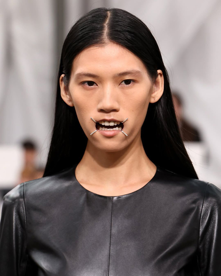 Модели с украшениями во рту, имитирующими стоматологические расширители. Показ Мейзон Маржела на Неделе моды в Париже, весна-лето, 2026 год