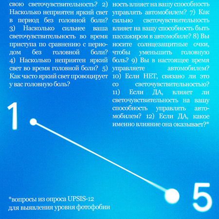 Для того, чтобы определять, насколько сильно фотофобия ограничивает жизнь пациента, был составлен опросник UPSIS-12, который состоит из 12 вопросов, представленных на плакате. При ответе на каждый вопрос предлагается дать ответ от 1 до 5. Итоговая сумма ответов даёт оценку уровню светобоязни.