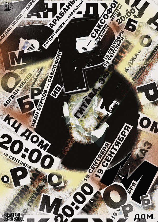 В этом плакате я старалась отобразить некое «сверление» необычной музыки группы через слух и восприятие слушателей. При этом было важно сохранить панковский дух и настроение творчества «БРОМа»