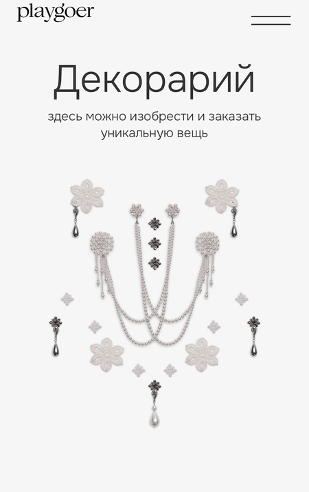 Бренд Playgoer запустил на сайте раздел «Декорарий» — интерактивную мастерскую по кастомизации одежды и аксессуаров, где пользователи могут самостоятельно создавать дизайн изделий. Процесс включает выбор базового изделия (например, худи, шубы, бомберы и др.), его цвета и добавление декоративных элементов, таких как жемчуг, бусины, цепи, цветы, броши в форме роз, вязаные элементы, люверсы, банты или стразы. Бренд производит заказ в мастерской; галерея на сайте* бренда позволяет делиться своими дизайнами.