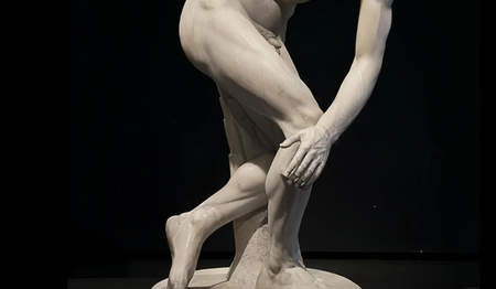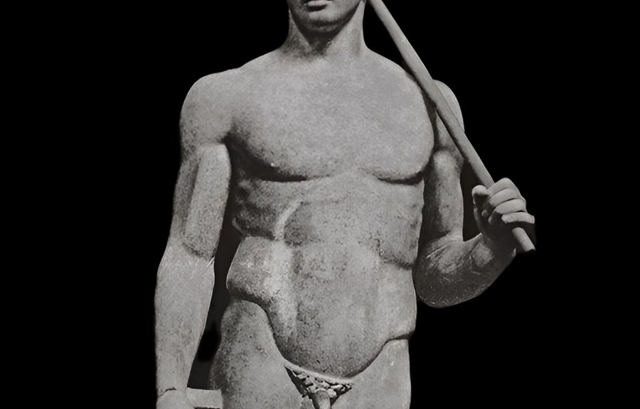 Это скульптура на которой изображен обнаженный мускулистый юноша, делающий шаг вперед.