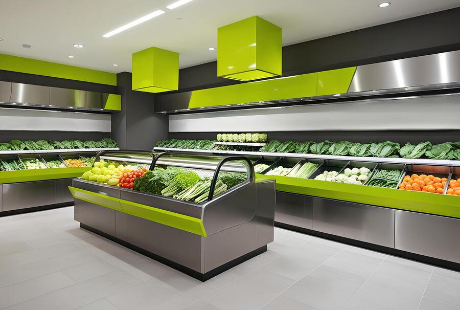 Prompt: The image shows a modern organic grocery store interior. The layout features a display of produce, vegetables and fruits with bright lime green accents. The overall design is modern, with an emphasis on functionality and aesthetic appeal, using a color scheme of green, gray and metallic tones to create a cohesive look.