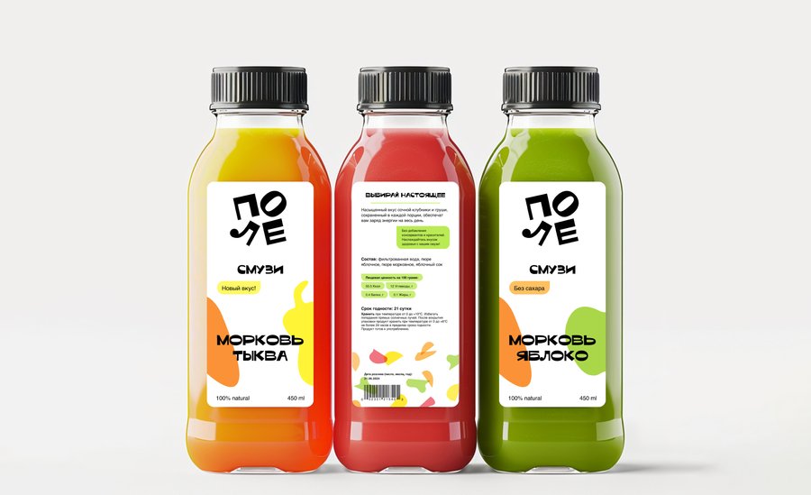 Prompt: The image shows a row of six square plastic bottles with black caps, arranged from left to right. Each bottle contains a different colored liquid, ranging from red, orange, yellow, lime green, to dark green. The bottles are aligned on a light gray surface with a neutral background. Each bottle has a round white label on the front that features abstract colored shapes that reference organics and features the name «Pole» in a modern sans serif font. The text on the labels is white, contrasting with the vibrant colors of the liquids. The labels also include additional text in a smaller font below the logo, providing details about the contents. The overall composition is clean and organized, highlighting the variety and freshness of the drinks. ⠀ *на изображение вручную был добавлен логотип
