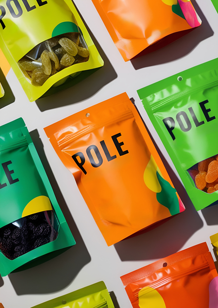 Prompt: The image is a high-resolution photograph with a flat layout. Layout: The composition consists of several colorful packages arranged in a grid. The packages are bright, each in its own color, lime, orange and yellow. On each package, the brand name «Pole» is prominently displayed in a bold black sans serif font. The text «Pole Fruits» is written under the brand name in a smaller font. Unique attributes: The packages have a sealed lid and a clear window, showcasing the organic dried fruit inside. The design includes abstract shapes in contrasting colors, adding a playful element to the package. The overall aesthetic is modern and eye-catching, appealing to a health-conscious audience ⠀ *в изображении вручную были удалены лишние детали и текст