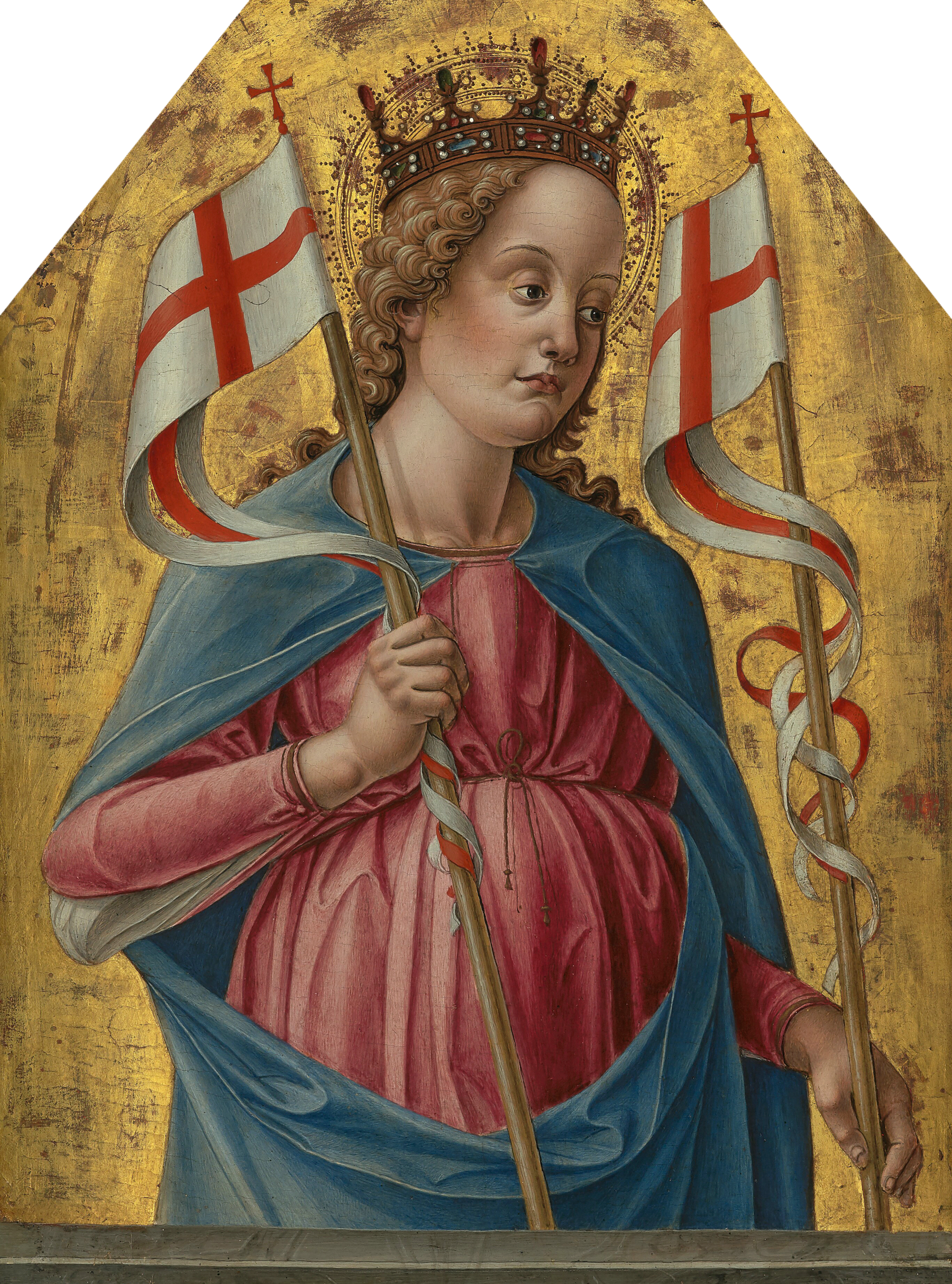 «Святая Урсула. Фрагмент полиптиха с апостолом Иаковом Старшим, Мадонной с Младенцем и святыми» был написан во второй половине XV века итальянским живописцем и скульптором Бартоломео Виварини и представляет собой образ идеализированной женской красоты святости. Фигура, увенчанная короной и держащая два флага с крестом святого Георгия, олицетворяет торжество христианской добродетели и усердное служение богу. В работе Виварини сочетает позднеготическую декоративность с телесностью Раннего Ренессанса и особым вниманием к деталям, формирующих характерную систему символов.