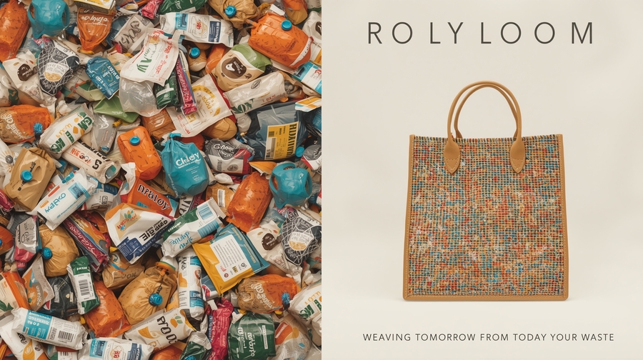 промт 1: modern advertising poster for eco-friendly bag brand, showing transformation concept: left side shows colorful plastic packaging waste, right side shows beautiful structured tote bag. Minimalist design, clean lines, earthy color palette with vibrant accents. Text: «PolyLoom — Weaving Tomorrow from Today’s Waste». Corporate minimalist style, very professional --ar 16:9 --style raw промт 2: minimalist event poster for «PolyLoom» sustainable fashion startup, featuring a geometric woven pattern made of recycled plastic threads in terracotta and cream colors. Modern typography, clean layout, eco-friendly aesthetic. Text elements: «From Waste to Wearable» and «Sustainable Fashion Revolution». Solid pastel background, very clean and stylish --ar 3:4 --style raw