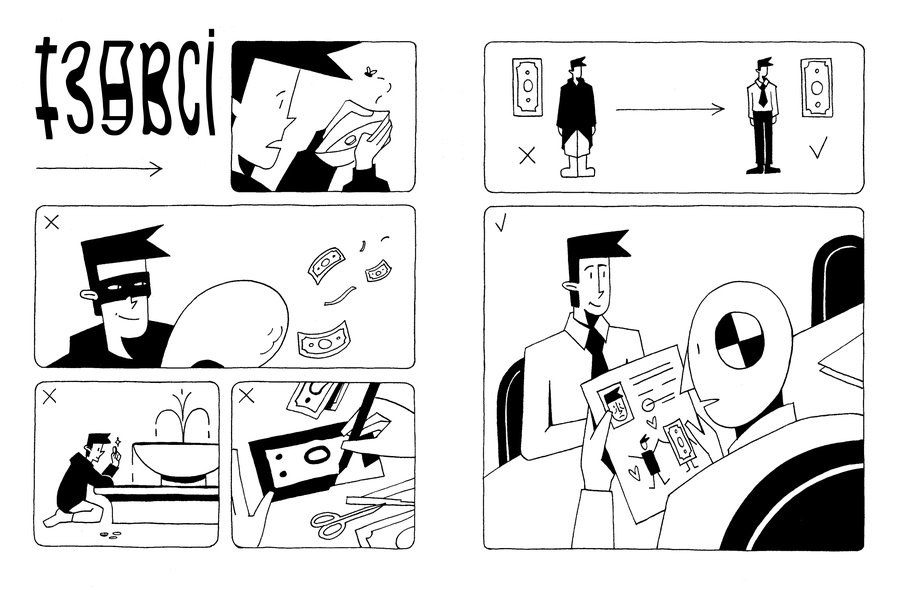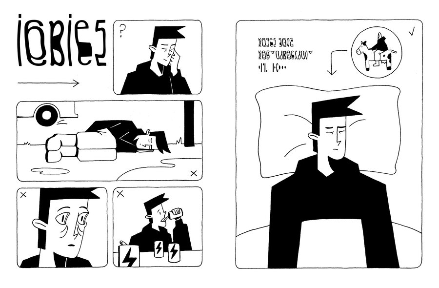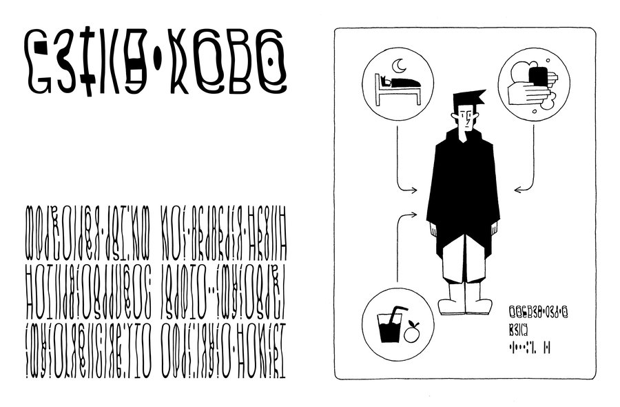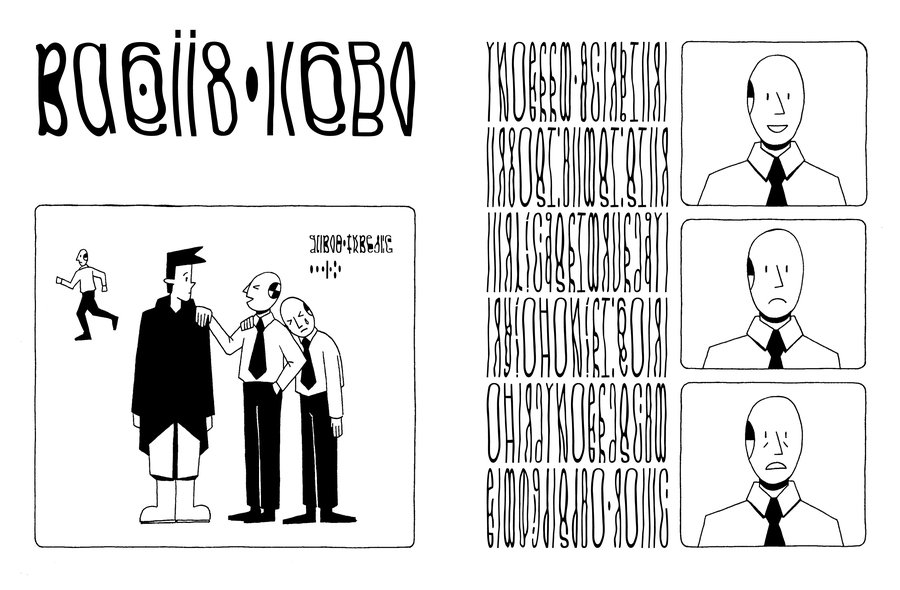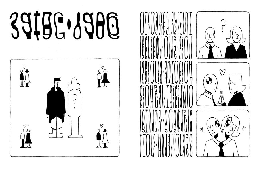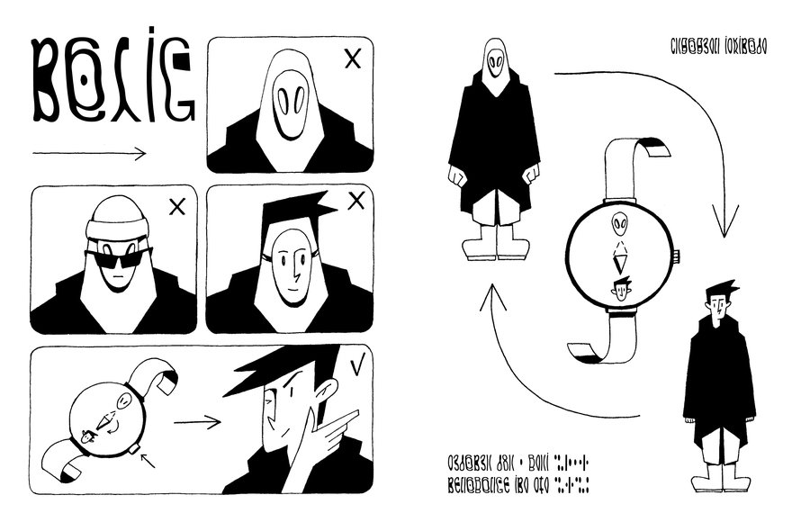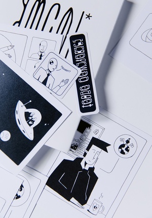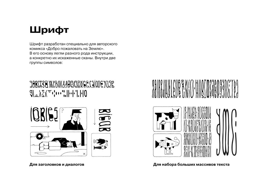 В проекте нет понятного для нас текста, всё повествование строится исключительно на визуальном языке и сопровождается нечитаемым шрифтом UFOnt, который был разработан специально для комикса. Целью проекта было взглянуть на нашу жизнь под другим углом, через призму юмора, глазами инопланетянина.