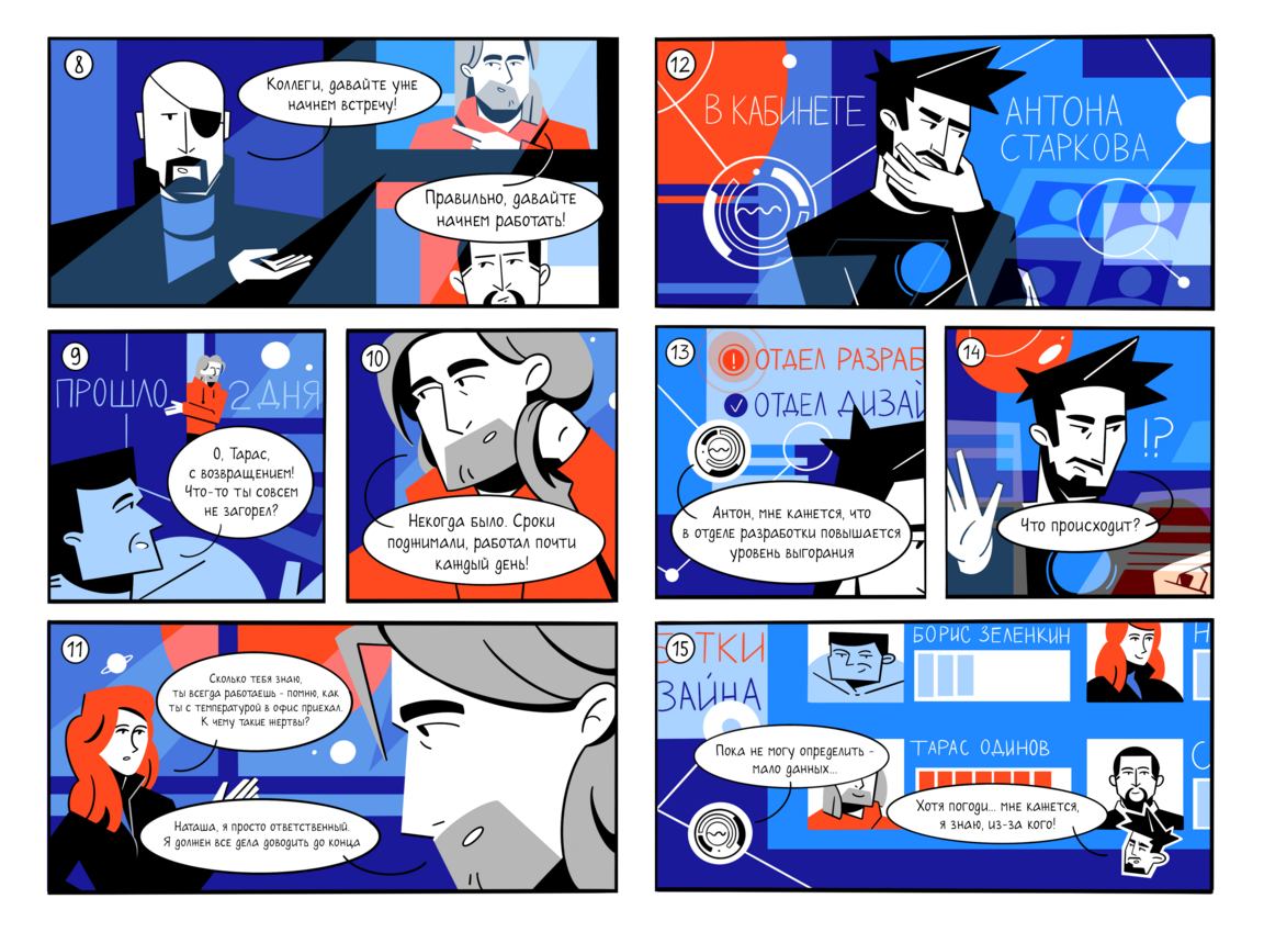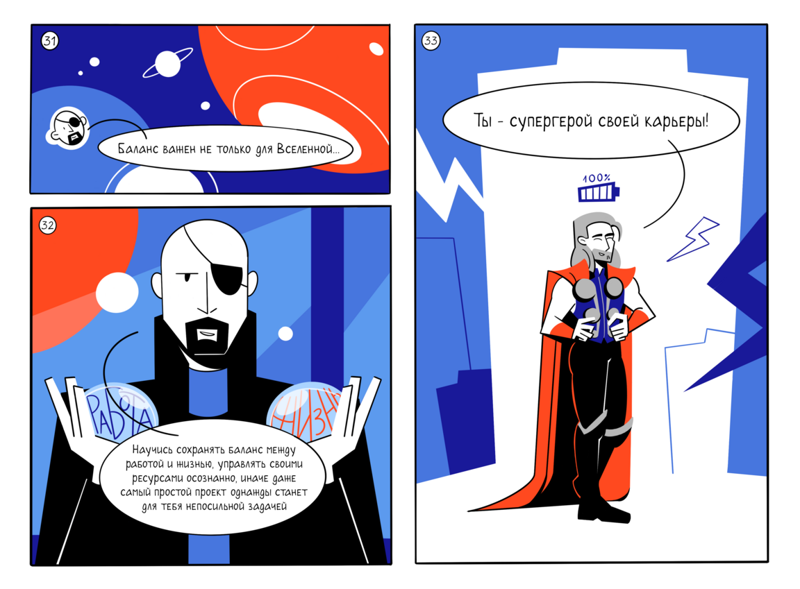 Герои комиксов — собирательные образы, отсылающие к популярным персонажам Marvel, которые многим знакомы. Каждый персонаж раскрывает одну из проблем, с которыми может столкнуться сотрудник — долгое пребывание в кадровом резерве, выгорание и т. д.