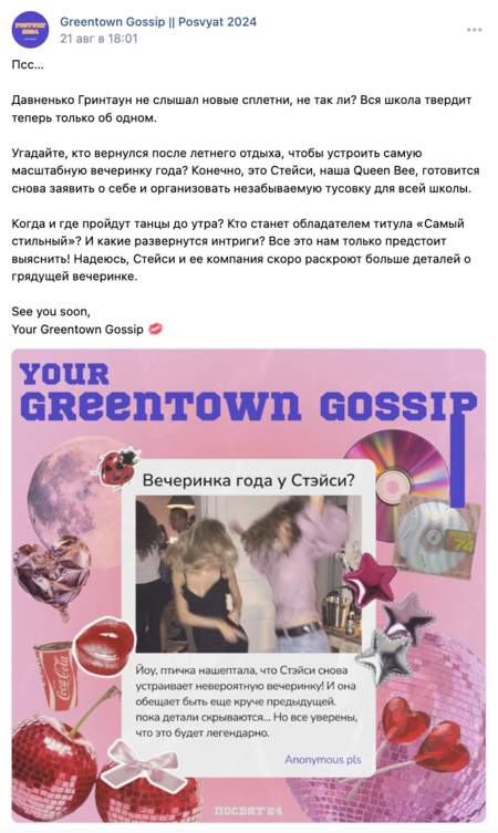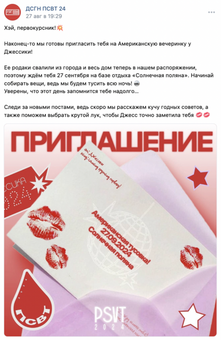 Еще со времени создания чата первокурсников менторы Школы Дизайна часто упомянули про «Посвят 2024». Также на пикнике для первокурсников и на адаптационной встрече мы раздавали пригласительные открытки, а в чате потока напоминали про мероприятия не раз. В этот период первокурсники ожидали не только первые пары, но и первую тусовку в университете.