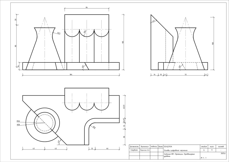 Проект представляет собой учебный альбом, созданный в рамках курса «Основы цифрового черчения». В нём собраны выполненные задания: орнаменты, сопряжения, архитектурные профили, декоративные формы, пространственные проекции, а также обмерный план здания Факультета гуманитарных наук НИУ ВШЭ по адресу: ул. Старая Басманная, 21/4.