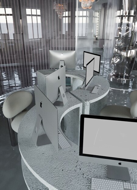 Интерьер объединяет элементы минимализма и современного дизайна. Холодные фактуры бетона и металла сочетаются с мягкими формами мебели и приглушённым освещением, создавая баланс между строгостью и уютом. Светильники в виде шаров наполняют помещения мягким рассеянным светом и добавляют динамику.