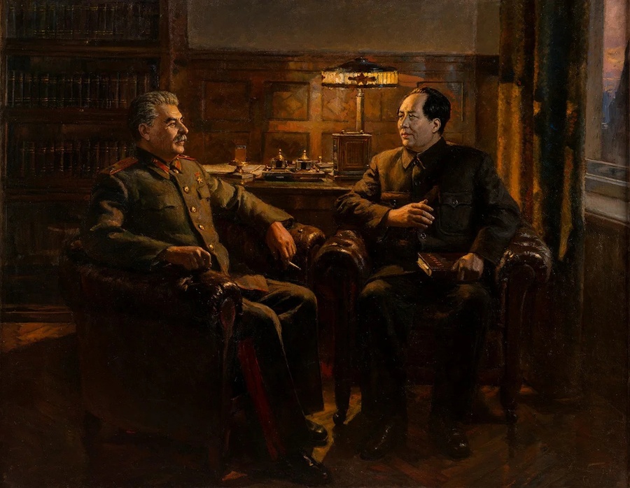 В 1945 заканчивается великая отечественная война, и вторая японо-китайская война. В 1949 в Китае к власти приходит КПК (китайская коммунистическая партия). С этого момента между СССР и КНР начался период великой дружбы, который изображён на картине Д. А. Набалдяна. Можно увидеть, что в послевоенных картинах СССР перпендикулярная горизонтальная линия заняла самое важное место. Комнаты на картинах наполнились качественными вещами и частично предметами роскоши. Полотна как бы говорят теперь всё стабильно, всё хорошо.