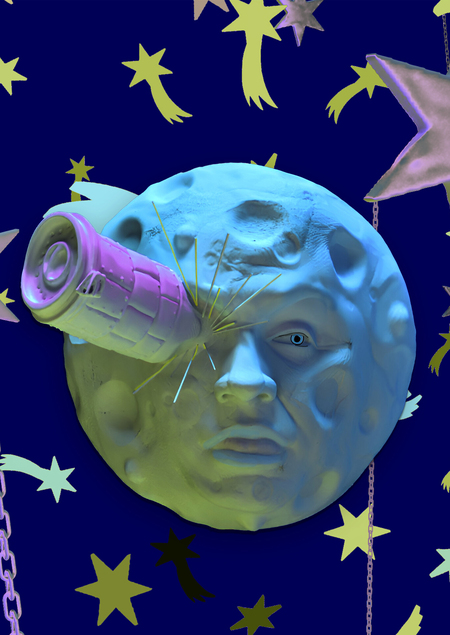 абстрактное пространство, символизирующее космос, вдохновленное фильмом жоржа мельеса. живая луна, проявляющая эмоции, падающие звезды, звездочет, небывалые планеты — ожившая сказка.