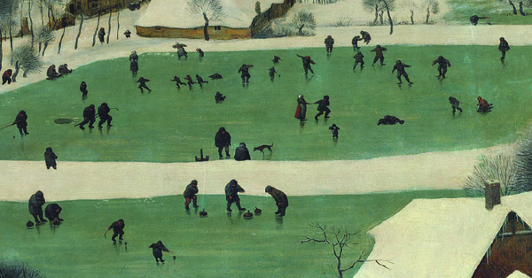 Тем не менее, другие жители деревни заняты делами, напрямую связанными с периодом, изображенным на картине. Группа людей разжигает костер, возможно, для готовки. На льду играют и катаются дети и взрослые — это исключительно зимнее занятие. Каждого человека можно рассмотреть, потому что они явно контрастируют со светлой природой.