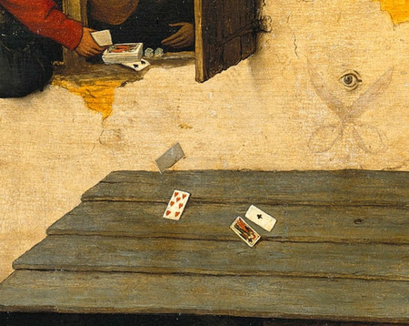 На первом фрагменте видны карты, которые летят вниз. Нетрудно догадаться, что это известная и в современное время поговорка «как карта ляжет», которая означает, что исход какой-либо ситуации будет зависеть от удачи и обстоятельств. На втором фрагменте тоже достаточно знакомое устойчивое выражение «смотреть сквозь пальцы», которое означает быть снисходительным к чему-то или кому-то. Каждая из поговорок напрямую связана с пренебрежительным отношением к жизни, Брейгель высмеивает безответственность.