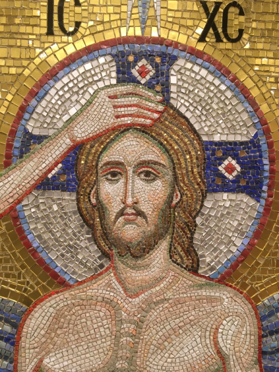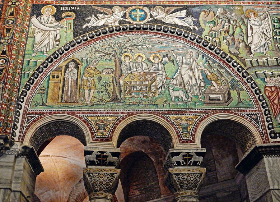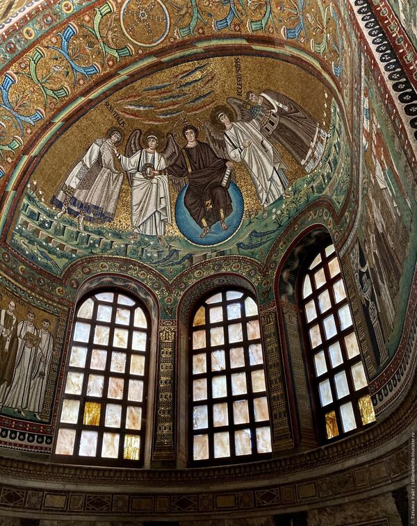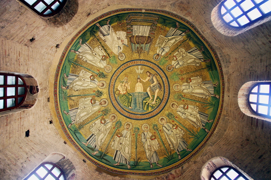 Небольшая купольная постройка являющаяся одной из старейших церквей в городе Равенны. Именно в этой небольшой «крещальне» на потолке расположена мозаика начала служительского пути Христа — его крещение в реке Иордан с Иоанном Крестителем, которое изображено в самом центре купола в золотом сияющем свете. Во втором круге изображены двенадцать апостолов в белых одеждах, которым Христос, словно передает служение крещения, и они торжественно несут эти дары окруженные золотыми узорами и райскими колоннами на глубоком синем фоне.