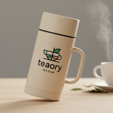 «Create a realistic mockup of a ceramic cup or thermos for the brand „Teaory“ featuring the same modern graphic logo. Minimalist cup or cylindrical thermos, with or without a simple handle; the logo is placed large on the front. Modern and clean style, with a strong focus on the logo and brand colors; allow inversions (light logo on dark background and vice versa). Base color of the object is white, warm beige, or dark charcoal; the logo and small graphic elements use the brand palette. Light and soft background, with a subtle hint of tea atmosphere (blurred background, tabletop), but without stealing attention from the logo. High resolution, 30–45 degree angle so that the logo and object shape are clearly visible»