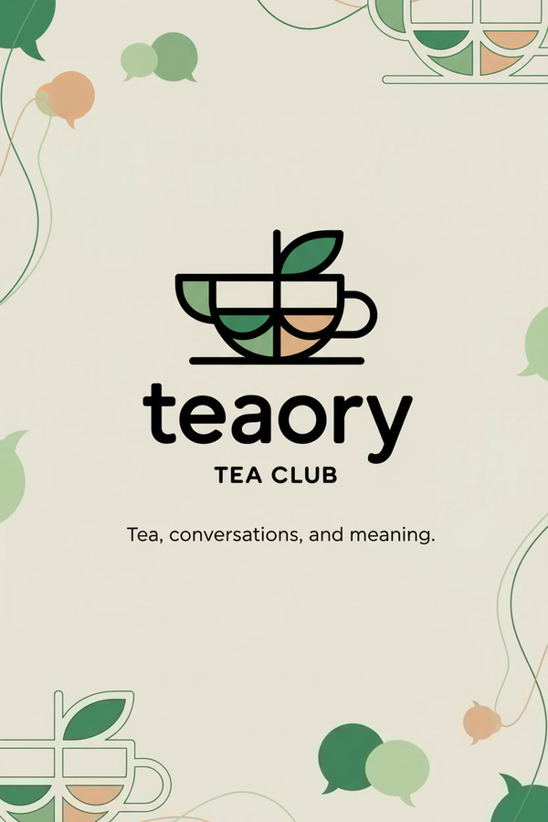«Create a modern promotional poster for the tea club „Teaory“. The poster should communicate the idea of tea, conversations, and community: include the „Teaory“ logo prominently, a short headline like „Tea, Talks & Theory“. Style: minimalist, clean layout, lots of negative space, light beige base with deep and light green accents, subtle leaf graphics echoing the logo. Vertical A3 or A2, high resolution»