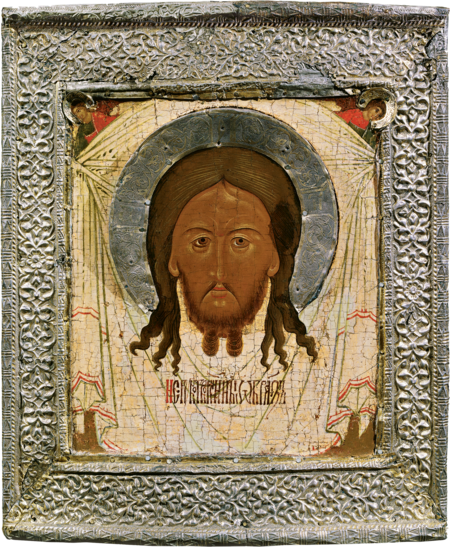 Использованный автором композиционный извод занимает промежуточное положение между кратким и полным вариантами Спаса Нерукотворного. Краткий и древнейший по своему происхождению вариант предполагает только изображение лика Христа на плате, которое возникло чудесным образом в тот момент, когда Спаситель отер им Свое лицо. В полном варианте сюжет дополняют две фигуры ангелов, которые поддерживают плат за верхние углы, стоя по сторонам от него. Извод этот, известный в Византии с XIV века, появляется на Руси только в XVI столетии. Такую композицию имел чудотворный образ, находившийся в городе Хлынове (современной Вятке). Промежуточный вариант сохраняет эту особенность, но ангелы написаны не в рост, а по пояс, и помещаются в верхних углах композиции, в то время как всё поле изображения заполняет лик Спасителя на убрусе. Композиционное решение с полуфигурами ангелов в верхних углах получает популярность в русской иконописи в произведениях небольшого размера во второй половине XVI — первой четверти XVII века, хотя эпизодически встречается и в более раннее время. На рубеже столетий в работах строгановских мастеров появляется еще целый ряд особенностей, связанных с иконографией Нерукотворного образа. Пряди волос на плечах Христа часто пишут несимметрично — две слева и три справа. Параллельно складывается и особый тип изображения самого лика Христа — хрупкого, с тонкими чертами, слегка впавшими щеками и короткой бородой с небольшими завитками, который получит широкое распространение в русской иконописи в первой половине — середине XVII века.