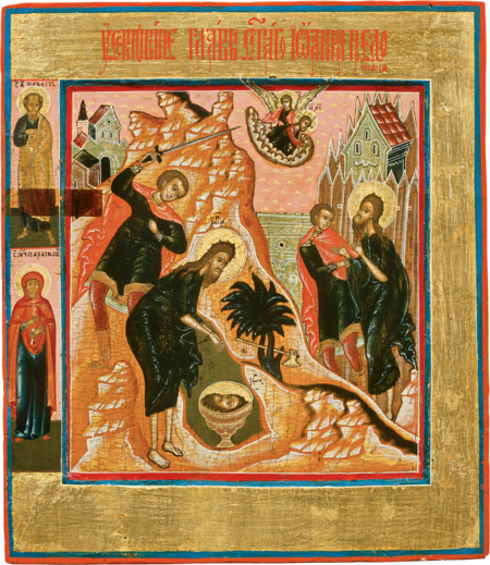 Иконография Усекновения главы Иоанна Предтечи как самостоятельный сюжет в иконе известна с рубежа XV–XVI веков. Первоначально очень простая, представляющая склоненного над чашей с его же главой Иоанна, над которым палач высоко заносит меч, она постепенно стала дробиться на отдельные эпизоды, и к середине XVII века широкое распространение получил извод, использованный в публикуемой иконе. На иконе палач и Иоанн показаны дважды. Справа палач ведет Иоанна из темницы на казнь, а Христос с облака, несомого ангелом, благословляет святого. Слева представлена сама казнь в традиционной композиционной схеме. Этот извод встречается как в прямом, так и зеркальном варианте. В конце XVII века в рамках поволжской художественной традиции рождается еще более развернутая композиционная схема, включающая сцену поднесения палачом главы Предтечи царевне. В Новое время она получила широкое распространение в старообрядческих центрах. Изображения святых — апостола Петра и мученицы Параскевы на левом поле — присутствовали на иконе изначально, о чем говорит живопись их ликов. Такое асимметричное расположение патрональных святых относительно средника встречается в иконах XVI–XVII веков. При поновлении образа имя апостола заменили на «Павел», но апостол Петр хорошо опознается по типажу и цвету одежд.