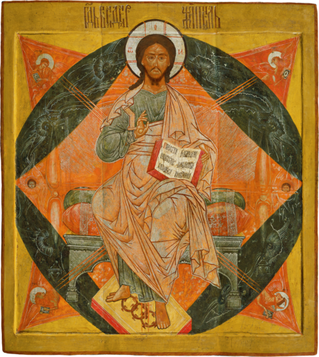 Сложная по смыслу символическая иконография «Спас в силах» складывается в русском искусстве на рубеже XIV–XV веков и основывается на текстах ветхозаветных пророчеств Иезекииля (Иез. 1, 4–28; 10, 1–22) и Исайи (Ис. 6, 1–4), а также Апокалипсиса. Ее применяли в составе высокого иконостаса — на центральном образе ростового деисусного ряда. Христос восседает на престоле на фоне наложенных друг на друга двух красных ромбов, между которыми находится синяя сфера. Это звездчатое изображение трактуется как образ мироздания, где внешний красный ромб с символами евангелистов олицетворяет землю, синий овал с Силами Небесными — небесную сферу, а внутренний красный ромб означает огонь, по тексту пророчества Иезекииля. Вплоть до конца XVII века такое изображение было наиболее популярным в среднике деисусных чинов иконостаса, пока в Москве придворные мастера не заменили привычную иконографию на новую — «Царь царем», соединявшую на одной иконной доске три центральные фигуры Деисуса. Тем не менее, в провинции, особенно в народной иконописи, еще очень долго использовали традиционный извод «Спас в силах».