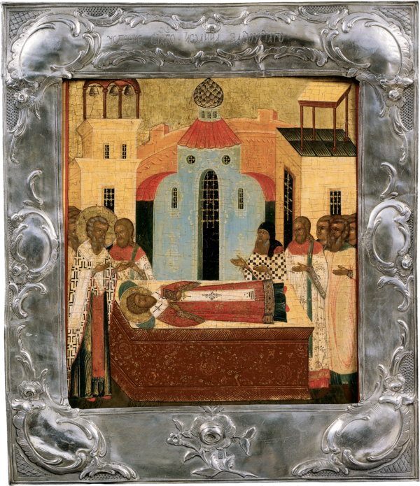 Успение св. Иоанна Златоуста — сюжет, не известный как самостоятельный в русской иконописи, хотя существование таких икон вполне правомерно из-за соответствия данной иконографии дню памяти святого. Эта сцена обязательно входила в состав житийных циклов святителя. Публикуемая икона представляет собой фрагмент большого житийного образа второй половины XVII века, который врезан старообрядцами в новую доску незадолго до 1770 года. При этом живопись клейма, уже имевшая утраты, была поновлена и идеологически откорректирована — персты правой руки Иоанна сложены в подчеркнутое двуперстие. Авторские лики сохранились достаточно хорошо. Их типажи, выражения, мягкая пластика объема, тонкий рисунок позволяют датировать произведение третьей четвертью XVII века. Икона имеет оклад, выполненный в стилистике рококо в Санкт-Петербурге мастером Иваном Фроловым в 1770 году. Бытование оклада, орнаментика которого следует европейскому стилю, в старообрядческой среде в XVIII столетии было еще вполне допустимым. Последовательное обращение к стилизации древнерусских мотивов в иконном убранстве произошло у старообрядцев только в XIX столетии.