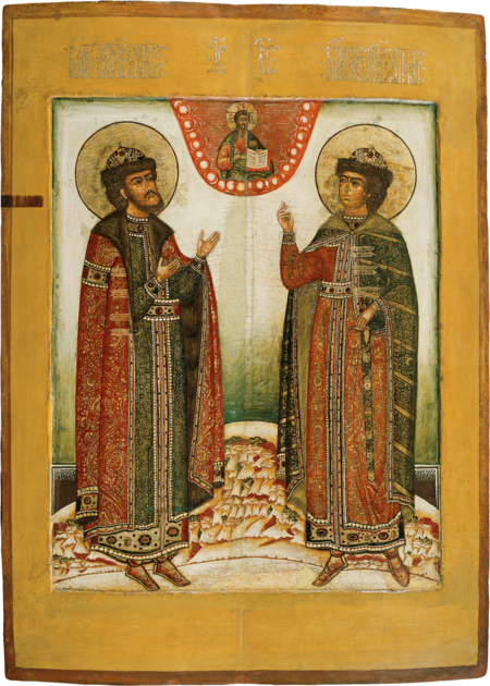 Иконография, где русские святые князья Борис и Глеб представлены в молении вполоборота друг к другу, получила распространение в русской иконописи на рубеже XVI–XVII веков, хотя по книжным миниатюрам известна гораздо раньше. До этого времени преобладающим вариантом изображения был тот, что восходил к древней иконе святых братьев, находившейся около их мощей в храме в Вышгороде близ Киева. Извод этот известен по значительному количеству древних списков с вышгородской иконы, созданных в разных художественных центрах Древней Руси. Для него характерна фронтальная постановка фигур князей, держащих атрибуты мученичества и княжеской власти — крест и меч. Святые князья Борис и Глеб всегда очень почитались на Руси, но особый интерес к ним, отразившийся и в сфере иконографии, связан с правлением царя Бориса Годунова, святым покровителем которого был один из братьев. Новая иконографическая схема, известная, в первую очередь, по произведениям строгановских мастеров, предполагала не только передачу фигур князей в развороте, но и сокращение их традиционной атрибутики. Так, на иконе Прокопия Чирина со святыми покровителями семьи Годуновых (ГТГ) князья, стоящие в центральной части композиции, показаны без мечей, а крест в поднятой согнутой в локте правой руке держит только Глеб. Этот жест для XVII века может считаться архаическим, поскольку в дальнейшем он почти перестанет изображаться.