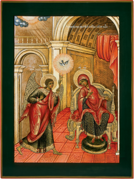 Стиль живописи публикуемой иконы очень архаичен. В темных и немного тяжелых по пластике ликах архангела и Богоматери явственно чувствуются отголоски художественных традиций XVI столетия. В то же время ряд иконографических деталей указывает на то, что образ не мог быть написан ранее середины XVII века. Так, перед Богородицей изображен столик на резной ножке, на котором лежит развернутая книга. Эта деталь связана с западным влиянием, пришедшим с гравюрами из североевропейских лицевых Библий, так же как и изображение пола, выложенного плитами «в шахмат». Нимбы Богоматери и архангела имеют форму, имитирующую металлический венец с гравированным орнаментом, но, в отличие от подобных нимбов более раннего времени, рисунок которых был награвирован по левкасному золотому фону, они подцвечены цветными лаками. Очень своеобразен колорит иконы — неяркий, основанный на сочетании ограниченного количества довольно приглушенных цветов: охры, оранжевато-красного, коричневого и глубокого синего. В то же время золотые контурные обводки, прописи золотом по волосам и крыльям архангела и легкие золотые узоры на синих одеждах придают произведению определенную изысканность. Архаичность художественного языка иконы наряду с ее иконографическими особенностями позволяют предполагать связь образа с локальной иконописной культурой Великого Устюга и Сольвычегодска, где среди местных памятников первой половины XVII столетия встречаются близкие по колориту и проработке пластики произведения.