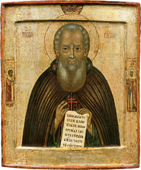 Небольшие поясные образы самого почитаемого русского святого — преподобного Сергия Радонежского — уже в XVI веке писались в иконописных мастерских при Троице-Сергиевом монастыре как раздаточные, то есть те, которые дарились почетным гостям обители или приобретались ее рядовыми посетителями. Иконография таких образов при всей своей традиционности с течением времени заметно менялась. Импульсом к изменениям было создание авторитетным мастером нового образа преподобного, где его иконографии придавалась иная редакция, или привоз в монастырь вкладной иконы, написанной художником, свободным от следования принятым в монастыре техникам. На иконах преподобного Сергия Радонежского с течением времени менялись жесты рук, сам облик святого — форма его бороды, прически. Неизменным оставалось лишь изображение Новозаветной Троицы в полукруглом небесном сегменте на верхнем поле — знак принадлежности образа Троице-Сергиеву монастырю, основанному изображенным на иконе святым Сергием. Публикуемая икона также относится к числу раздаточных икон монастыря, выполненных работавшими при нем мастерами. Очень точно опознается ее образец — икона, написанная знаменитым изографом Симоном Ушаковым в 1669 году и вложенная в монастырь царским оружейничим Богданом Матвеевичем Хитрово (ГТГ). Иконографически они совпадают во всех деталях. Так, святой представлен с короткими волнистыми волосами, плотно прилегающими к голове. Эта деталь совсем не характерна для изображений Сергия, которого издавна писали с удлиненными пышными волосами. К старому варианту монастырские мастера вернулись уже в начале XVIII века, как и к более традиционным жестам рук святого.