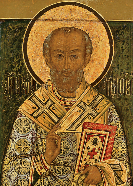 Святитель Николай Чудотворец, епископ города Миры Ликийские в Малой Азии, чье подвижничество и чудеса снискали ему славу еще при жизни, — самый почитаемый святитель на Руси с древнейших времен. По многочисленности иконных изображений, в том числе житийных, св. Николай превосходит всех других святых. Ему было посвящено огромное количество храмов; многие образы святого прославились как чудотворные, еще больше пользовались местным почитанием. Публикуемая икона с поясным изображением святителя Николая Чудотворца также, по-видимому, очень чтилась; при раскрытии с нее было снято три слоя записи. Сам образ крайне традиционен по композиции. Святой Николай представлен на темно-зеленом фоне со стилизованными облаками; одежды его украшены типичным для середины XVII века орнаментом в виде круглых медальонов с узорчатыми крестами. Интересна форма авторской надписи, где использовано греческое слово «агиос» (святой). Надписи на греческий манер становятся популярными в русской иконописи в связи с церковными реформами патриарха Никона, начатыми в 1650-х годах. Образ имеет близкие иконографические аналогии среди памятников ярославской провинциальной иконописи второй половины XVII столетия, в частности с иконой из старообрядческой моленной купцов Выжиловых в Угличе (УГИАХМ). Фигура святого, его одежды, Евангелие по виду почти полностью совпадают, как и типаж лика. Единственное отличие иконы из Углича от публикуемого памятника — изображение Богоматери и Христа в облаках в верхних углах композиции в сцене Никейского чуда. Но они имелись и на представленном образе, однако сохранились плохо и не были реконструированы при реставрации. Совпадает и греческая форма написания имени святого.