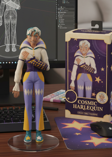 Промпт для Gemini: First ask me to upload an image and then create a 1/7 scale commercialized figurine of the characters in the picture, in a realistic style, in a real environment. The figurine is placed on a computer desk. The figurine has a round transparent acrylic base, with no text on the base. The content on the computer screen is a 3D modeling process of this figurine. Next to the computer screen is a toy packaging box, designed in a style reminiscent of high-quality collectible figures, printed with original artwork. The packaging features two-dimensional flat illustrations.